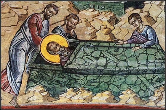Коли настав час відходу апостола Іоанна до Бога, він вийшов за межі Ефесу з сімома своїми учнями і наказав приготувати для себе в землі хрестоподібну могилу, в яку ліг, сказавши учням, щоб вони засипали його землею.