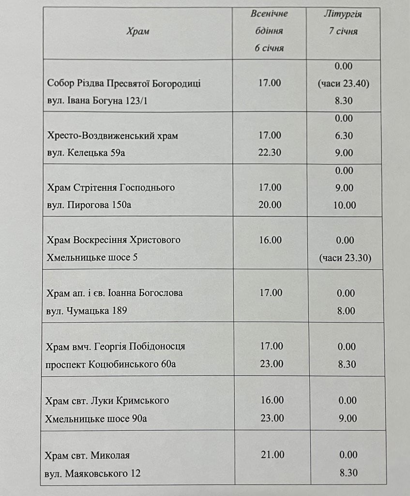 Розклад різдвяних богослужінь у головних храмах міста Вінниці (6 – 7 січня 2021 р.):
