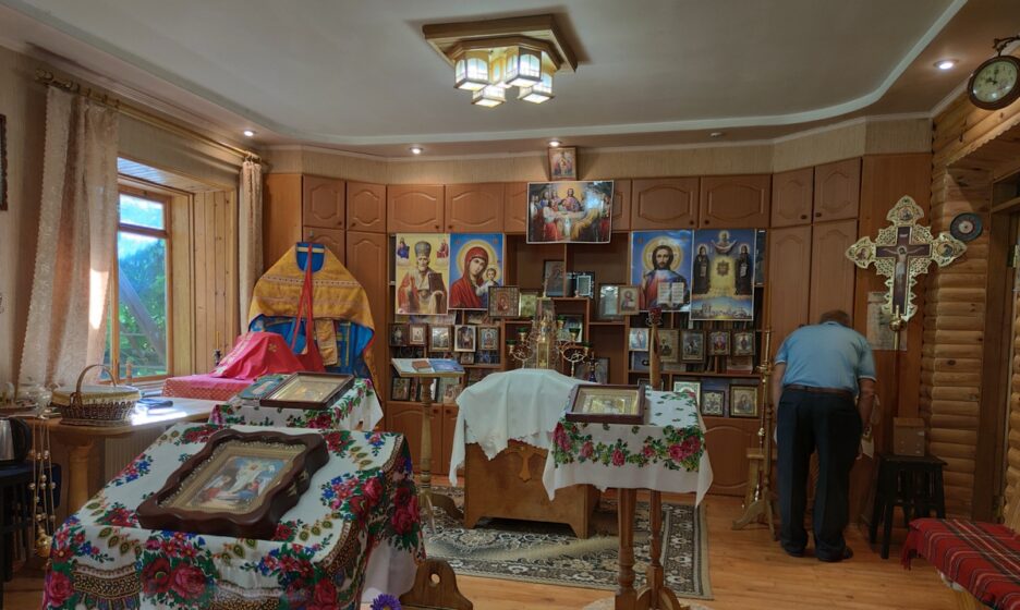 Господар будинку — пенсіонер Василь Павлович Костюк, колишній енергетик. Він щойно повернувся з Києва, з багатотисячного молитовного стояння під стінами Верховної Ради. Натхненно і радісно розповідає мені, скільки народу було, з яких єпархій, як співали канони і читали акафісти, як поліція відібрала у нього плакат зі зверненням до Константинопольського Патріарха. Але мене більше цікавить храм в його будинку. Свою розповідь Василь Павлович починає з сумного грудня 2018 го, коли парафіяни втратили свій справжній храм: