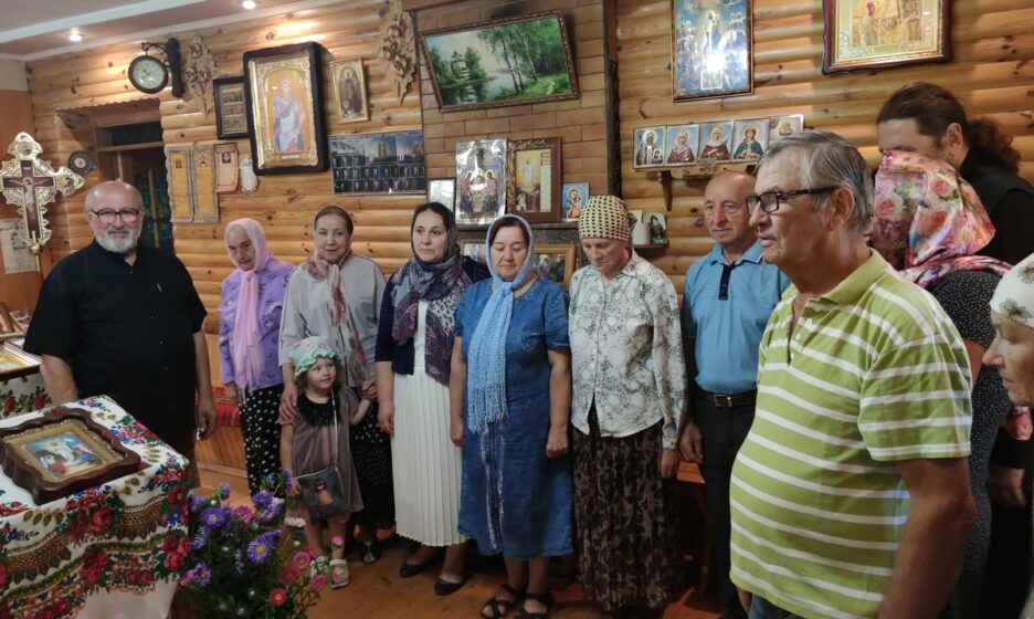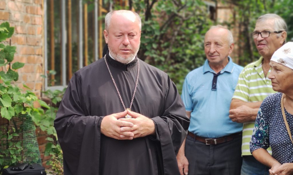 Поки ми розмовляємо, у двір починають стягуватися парафіяни — дізналися, що приїхав кореспондент «Правміра». Їх небагато, десятка півтора — день будній, а в селі гаряча пора збирання картоплі, більшість зайнято на городах. «Слава Богу!» — вітають мене люди майже в тій же тональності, в якій зазвичай вимовляється «Слава Україні!». Спершу відповідаю так само: «Слава Богу!» — не відразу зрозумівши, що відповідати треба: «Навіки слава!» Таке традиційне привітання у православних вінничан.