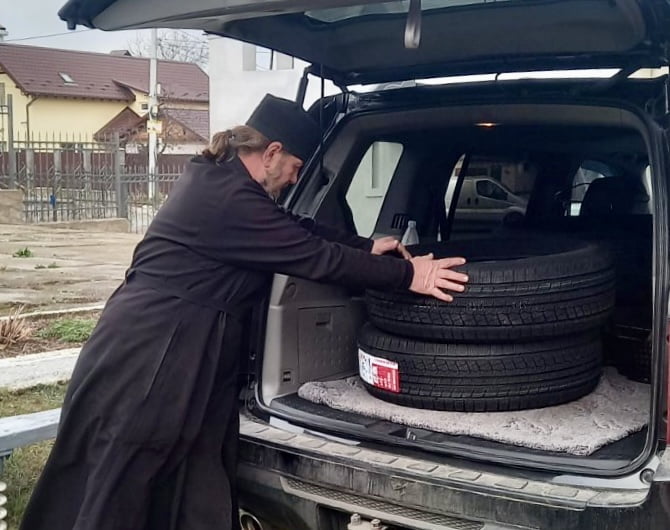 На зібрані пожертви парафіянами було придбано шини для автомобіля, які цими днями настоятель Чудо-Михайлівського храму протоієрей Василій Августінов передав нашим захисникам на передову.