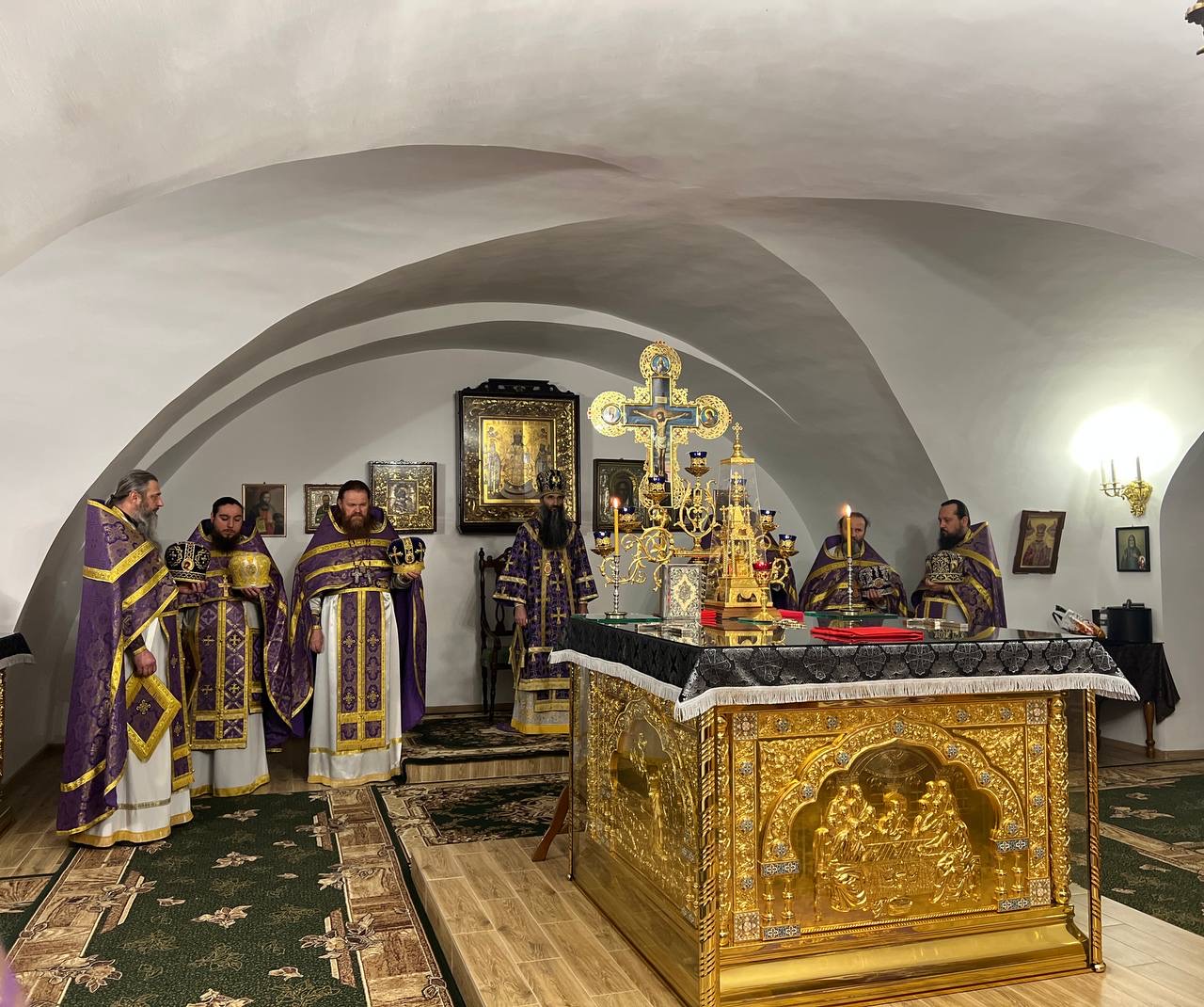 Богослужіння відбулося у нижньому Антоніє-Феодосіївському храмі обителі. За богослужінням архіпастирю співслужили секретар єпархії архімандрит Єнох (Торок), секретар Єпархіальної ради архімандрит Філарет (Олівінський) та клірики монастиря.